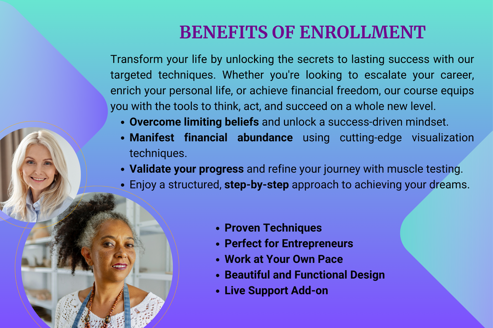 Transform your life by unlocking the secrets to lasting success with our targeted techniques. Whether you're looking to escalate your career, enrich your personal life, or achieve financial freedom, our course equips you with the tools to think, act, and succeed on a whole new level.